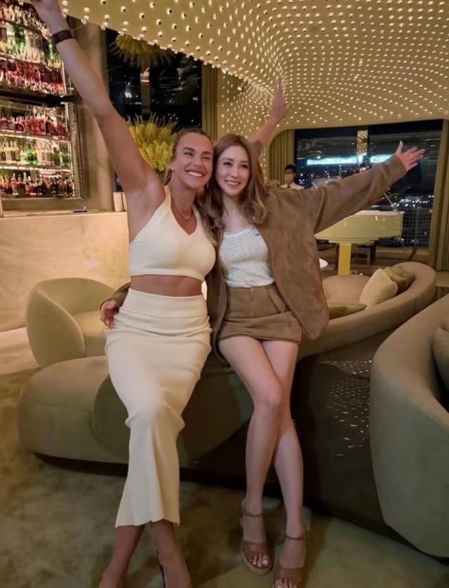 徐子淇在萨巴伦卡身边,就像是一个久未见面的好闺蜜,她拿着手机给萨巴伦卡拍照,一点没架子。